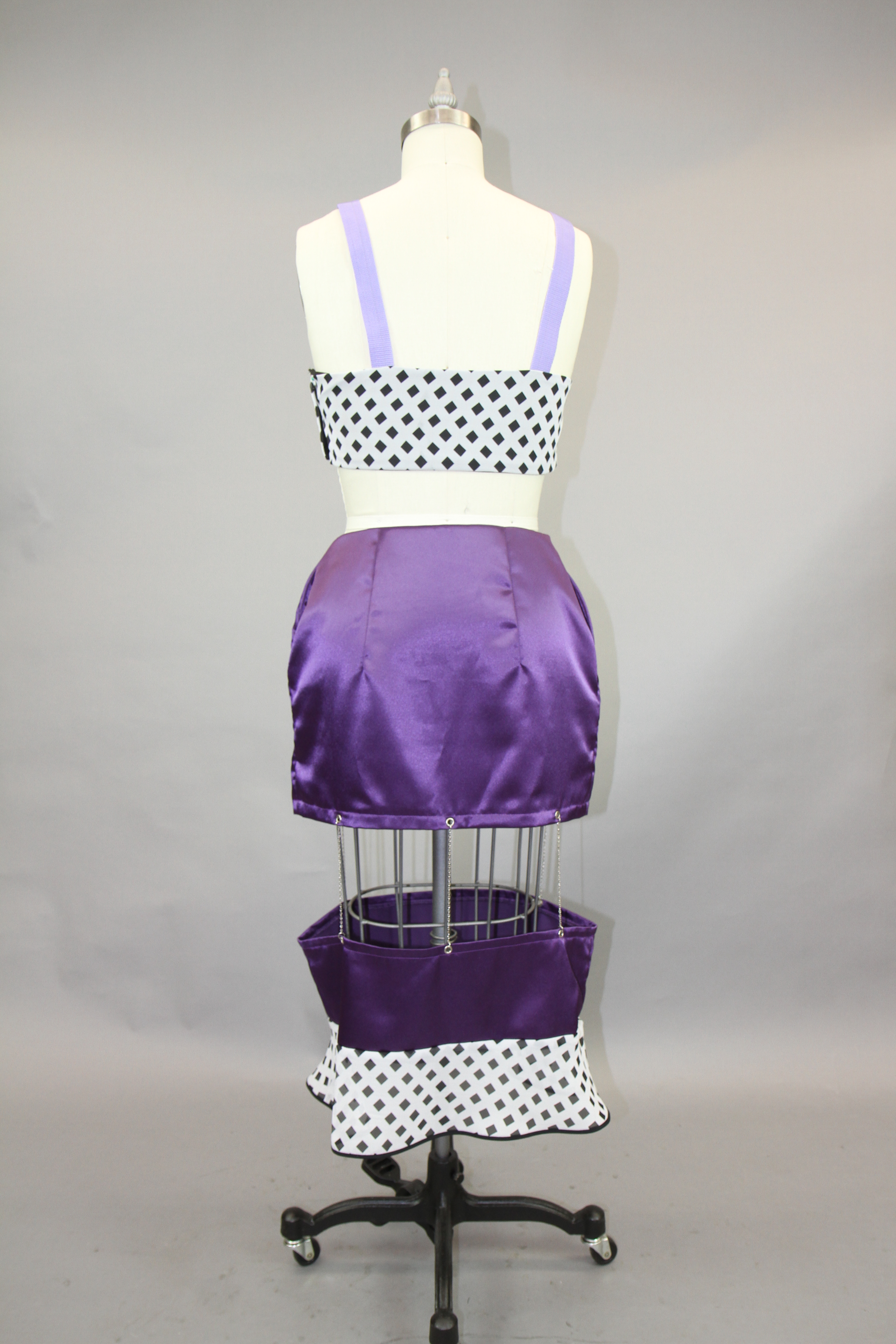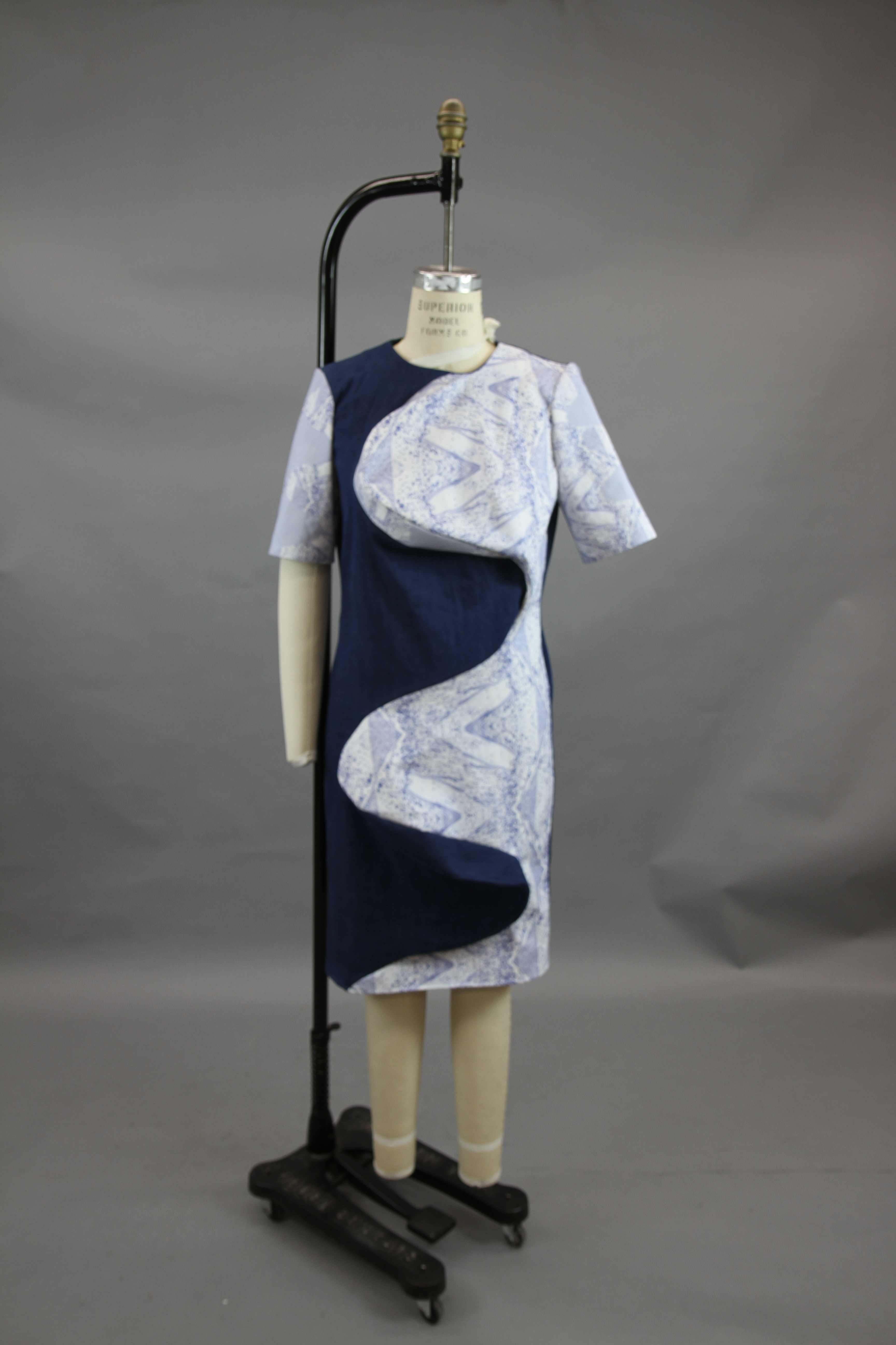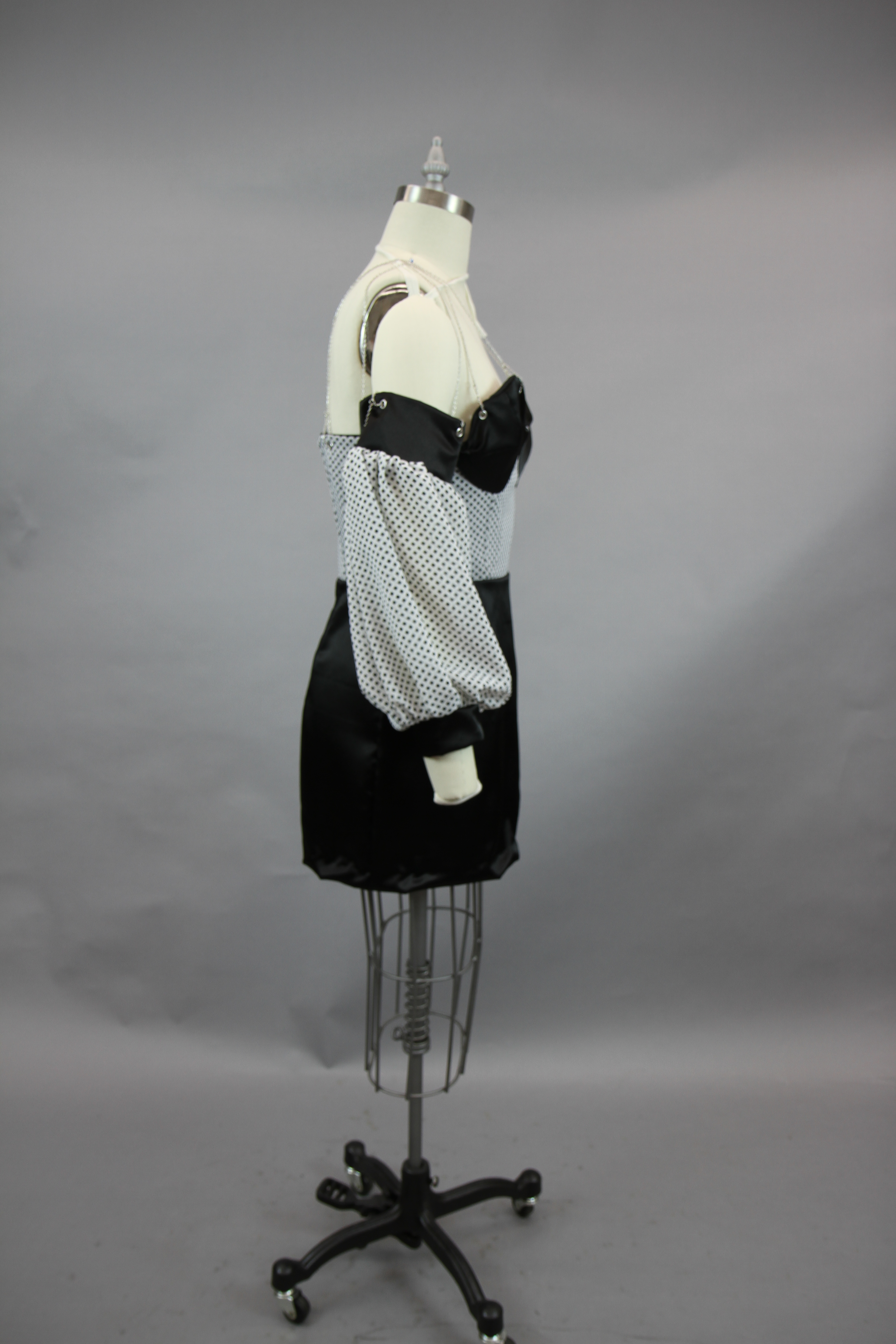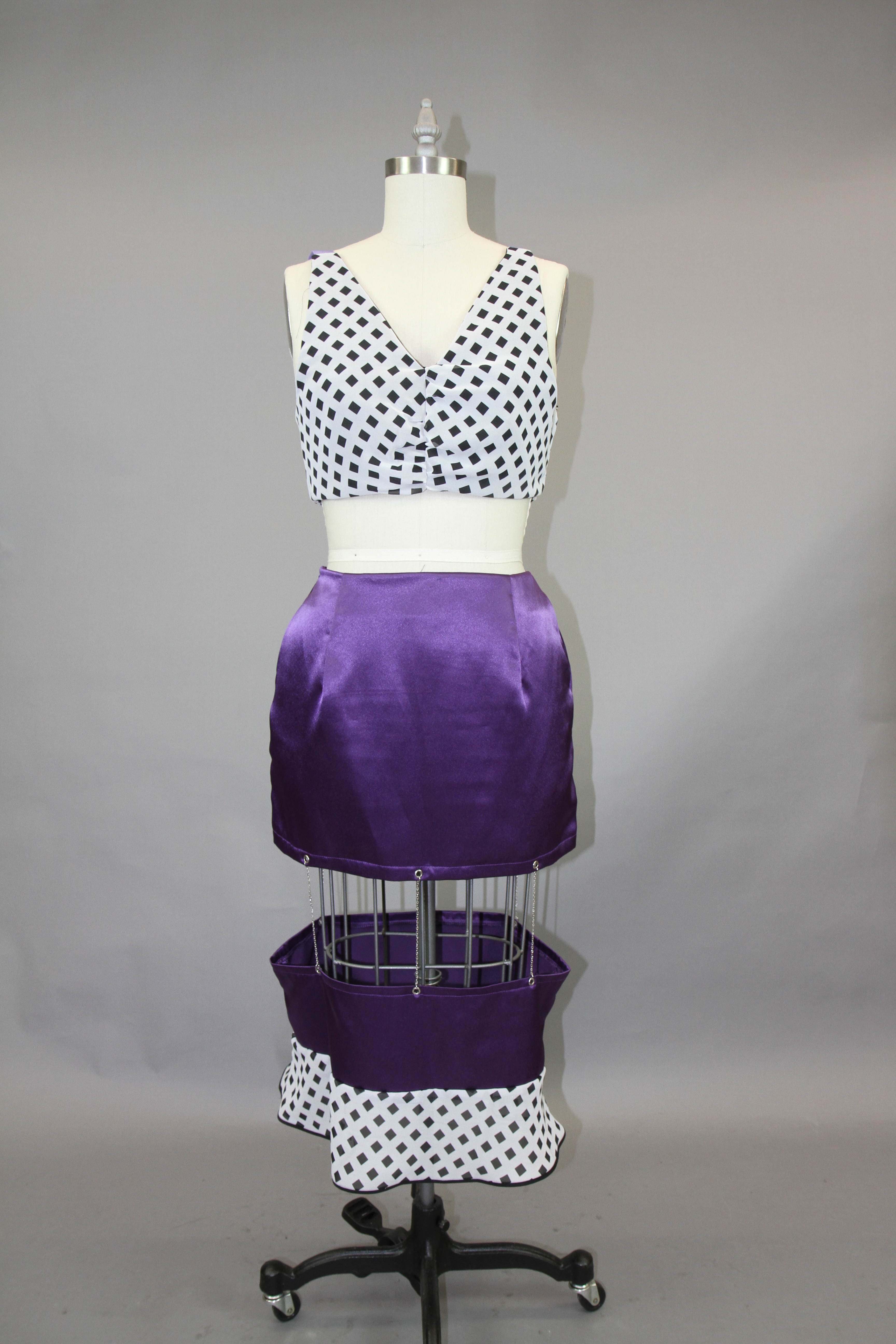 This class focused on the creation of a collection using the skills that the designers have learned throughout their fundamental classes. The collection I created works to combine draping and flat patterning. I wanted to play with different mediums for these garments, adding in grommets and chain as well as boning to create structure in the black and white garment.