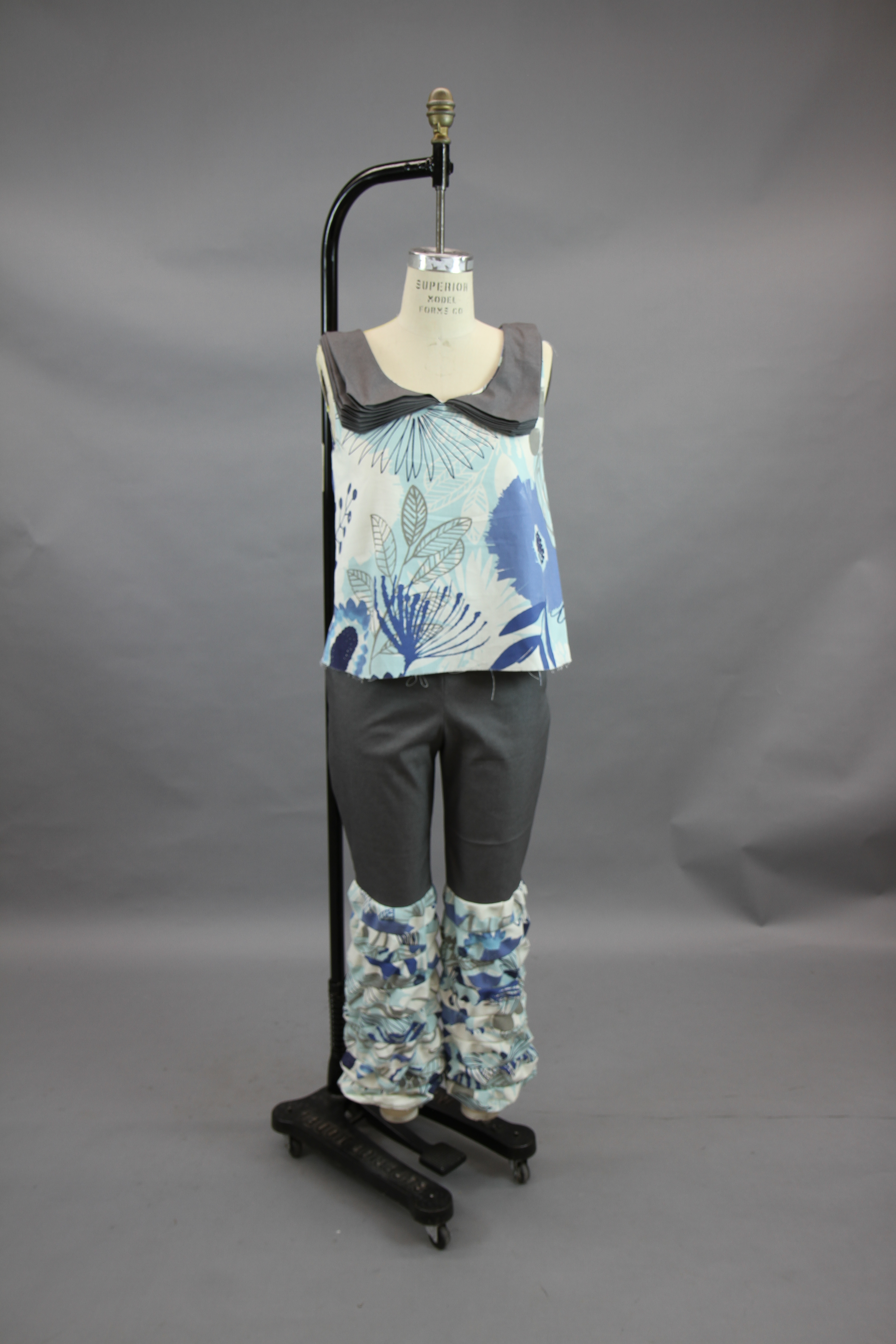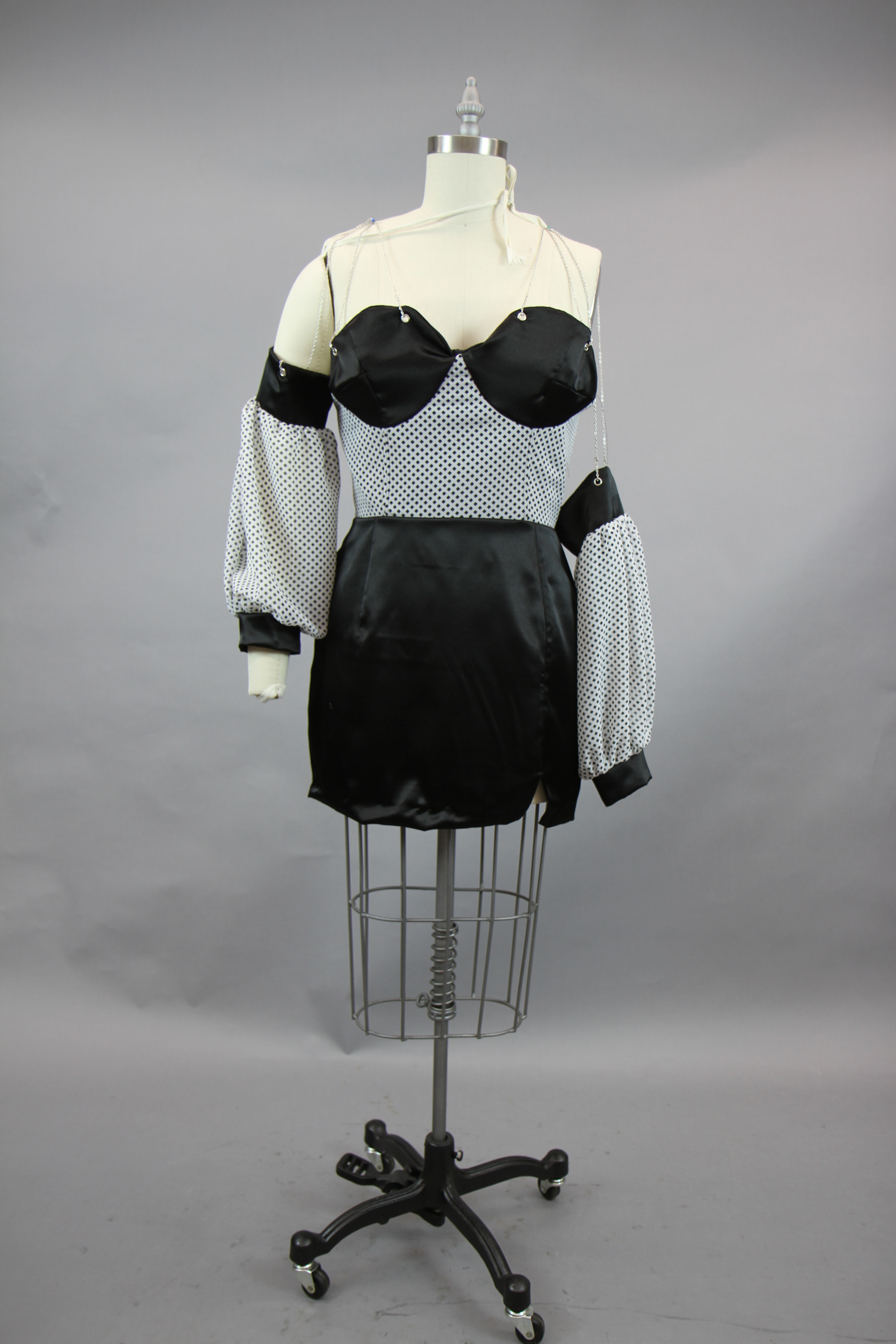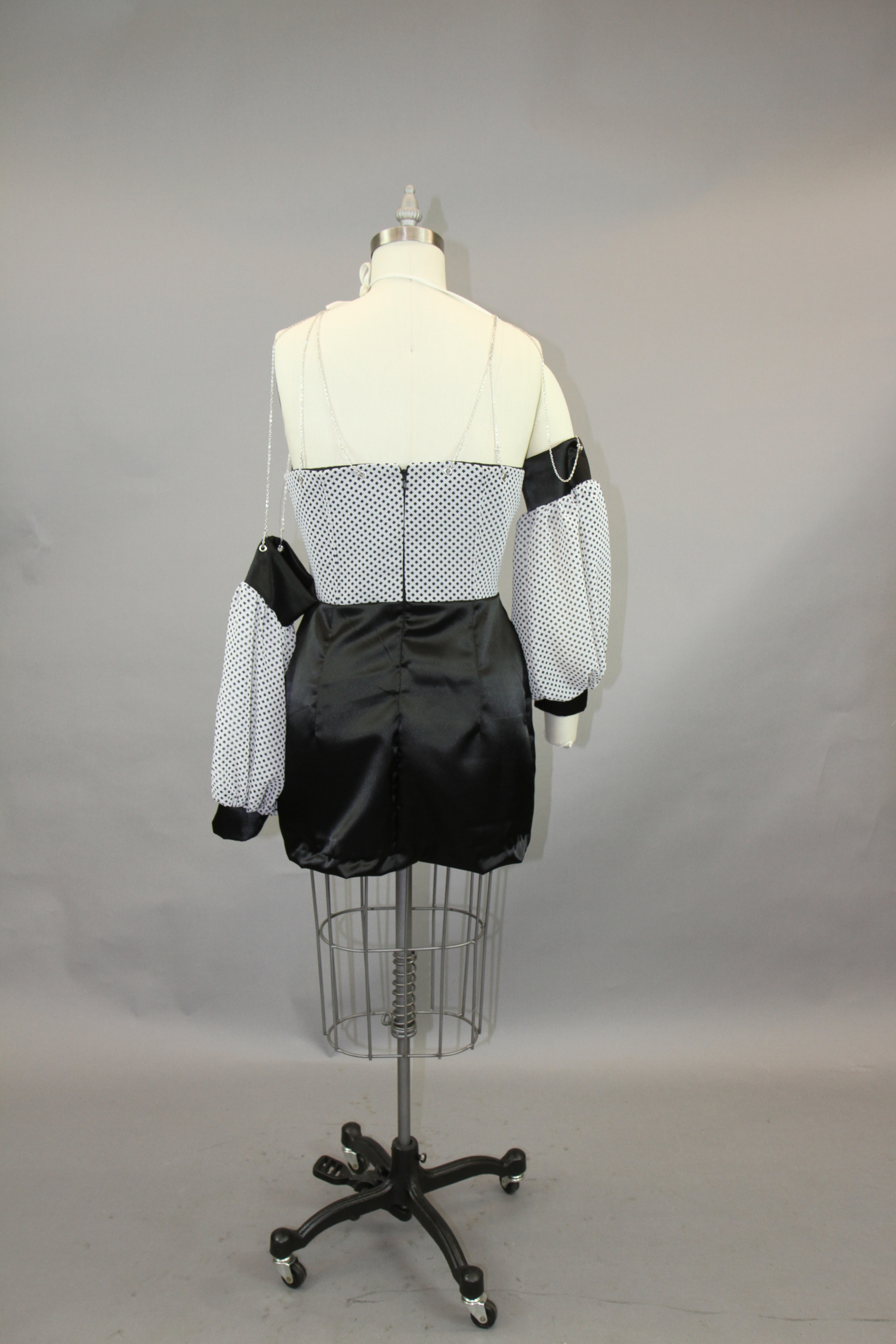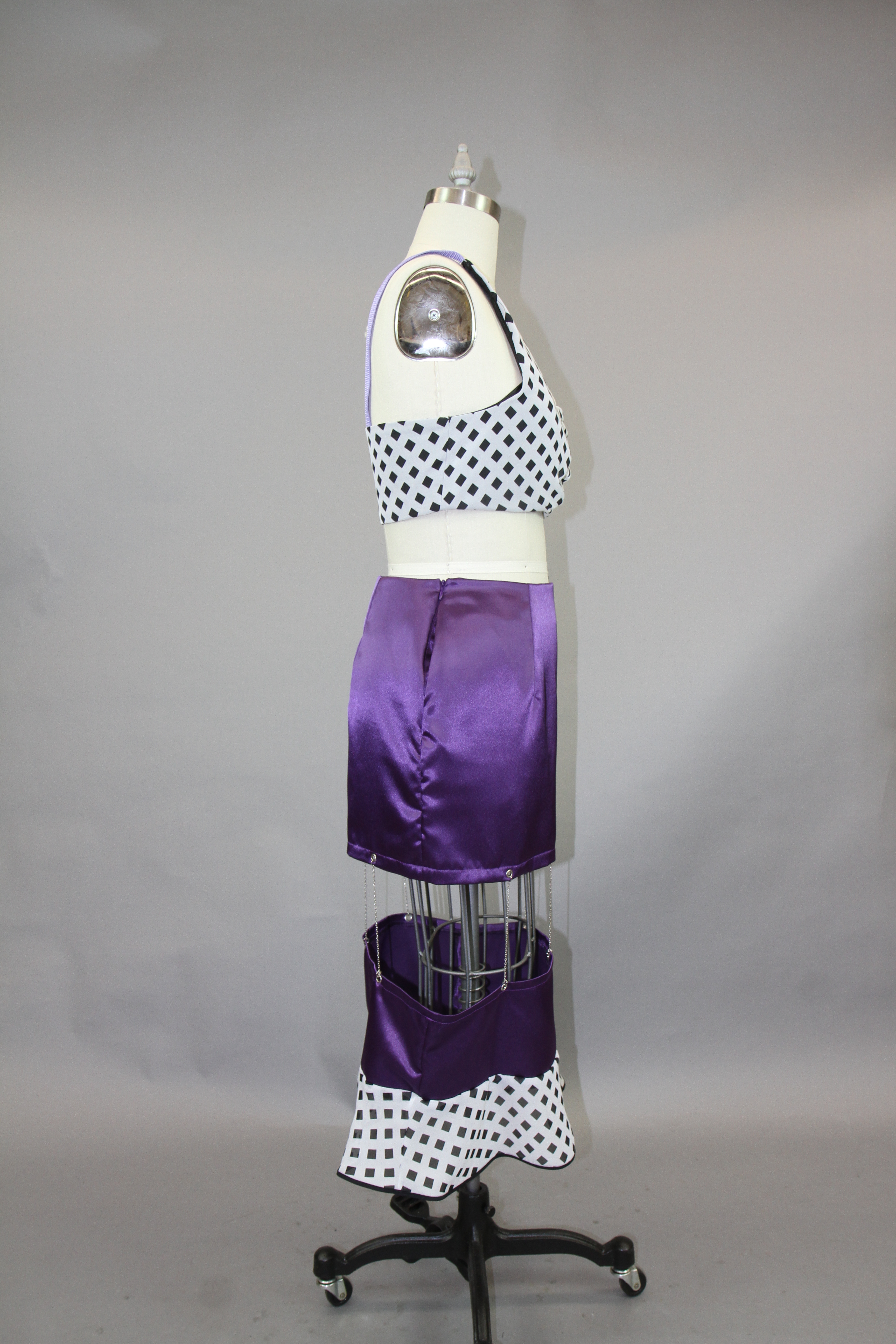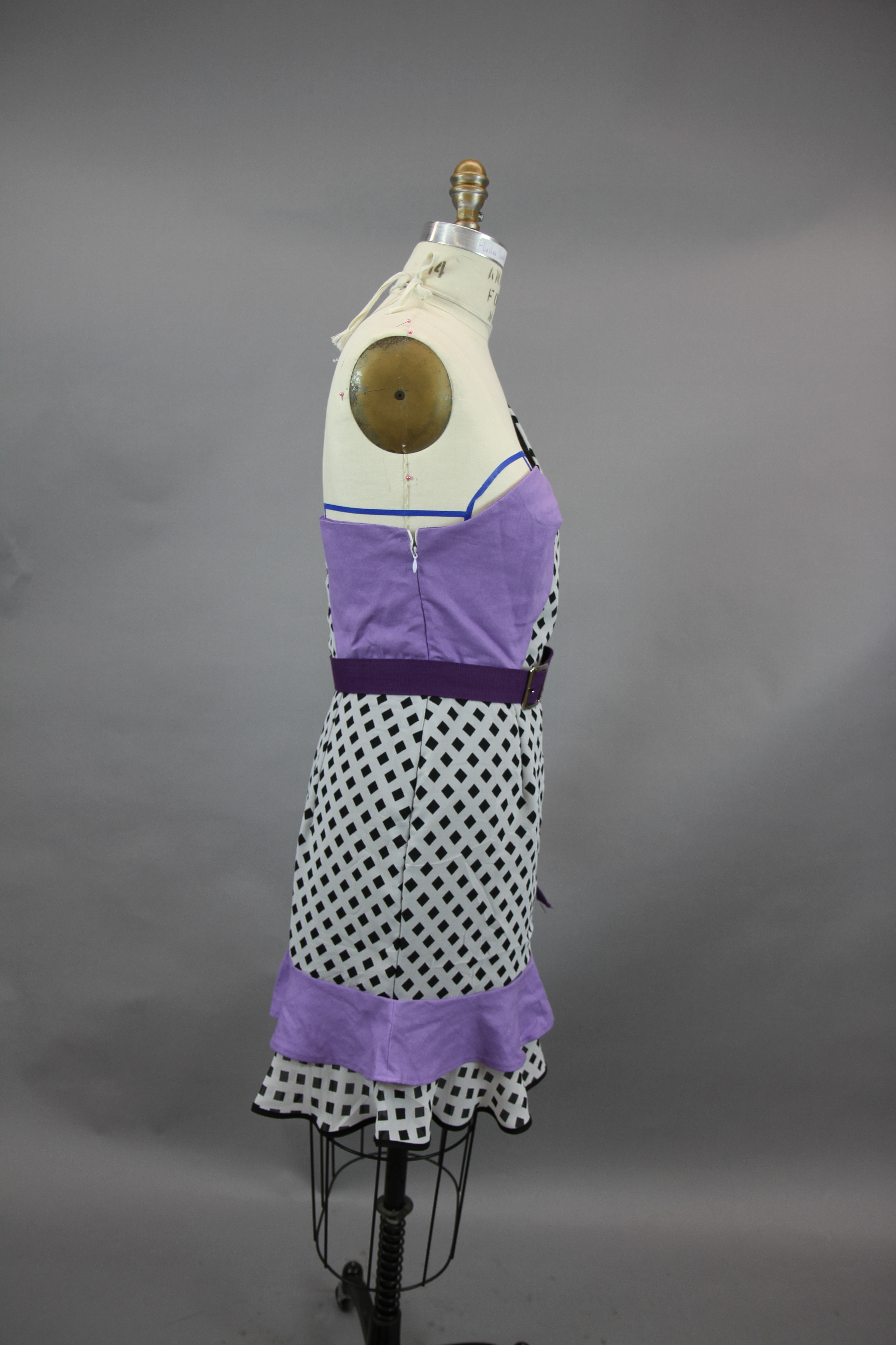 This class focused on the creation of a collection using the skills that the designers have learned throughout their fundamental classes. The collection I created works to combine draping and flat patterning. I wanted to play with different mediums for these garments, adding in grommets and chain as well as boning to create structure in the black and white garment.